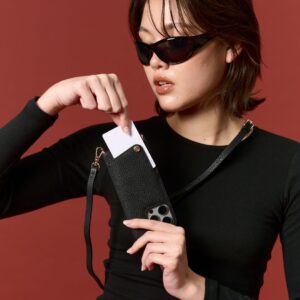 The Aria Elegant Strap Crossbody Slim Design iPhone Wallet is a timeless masterpiece, embodying both sophistication and minimalist charm. Meticulously crafted from genuine black pebble leather and adorned with subtle gold-tone accents, this wallet seamlessly blends style with functionality.