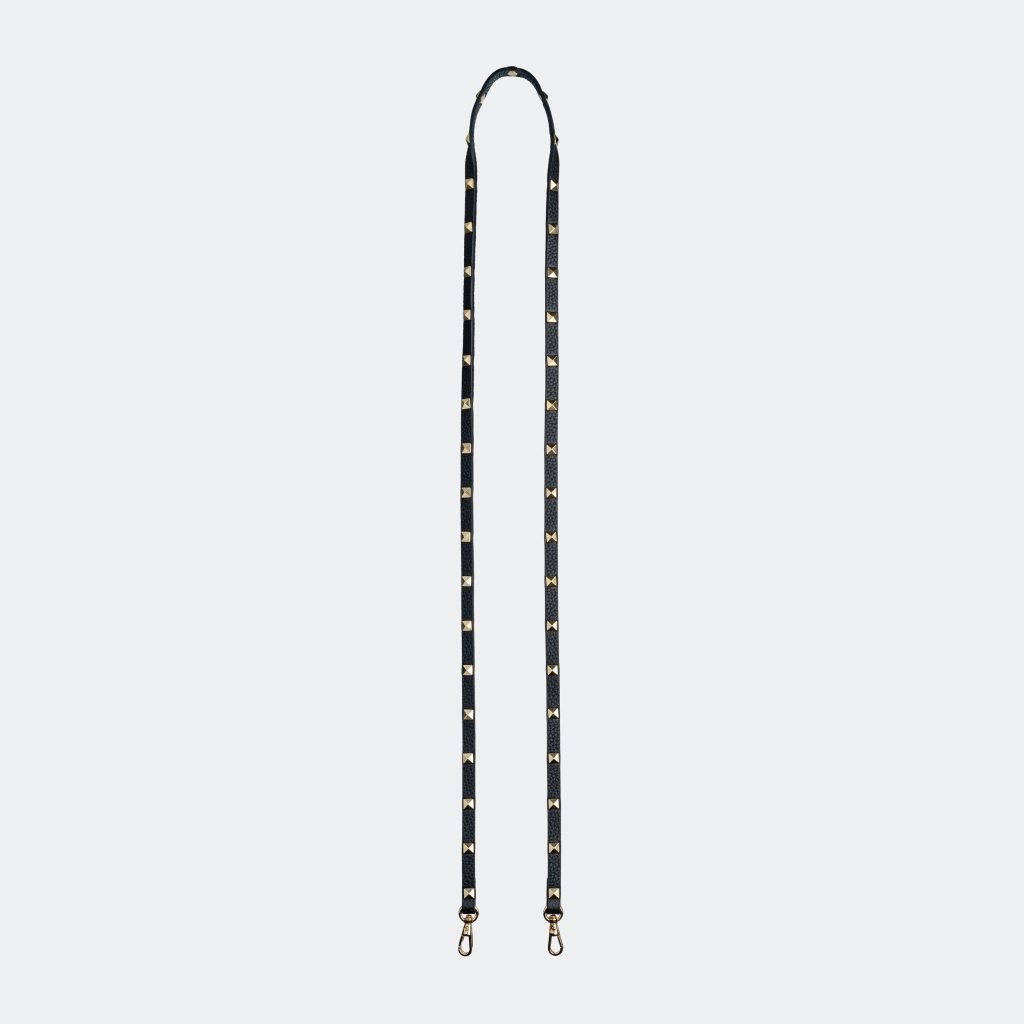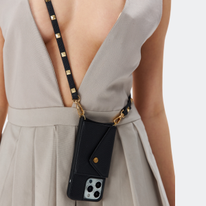 Gold Studs for That Exquisite Touch Pyramid-Studded Strap crossbody with a lustrous gold tone buckle. Features a seamless detach for stand-alone phone case use.
